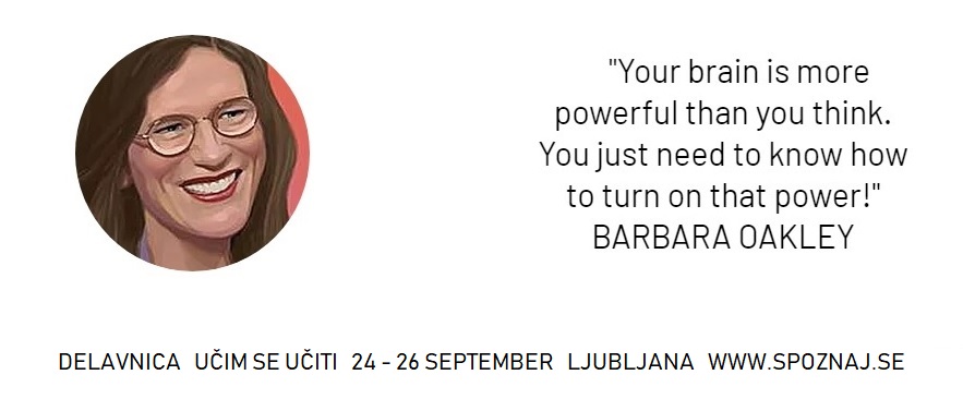 vabiva vas na delavnico Učim se učiti, ki jo bo vodila Barbara Oakley (ZDA). Delavnica bo potekala od 24. – 26. septembra in je namenjena staršem, učiteljem in vsem, ki vas zanima učenje.