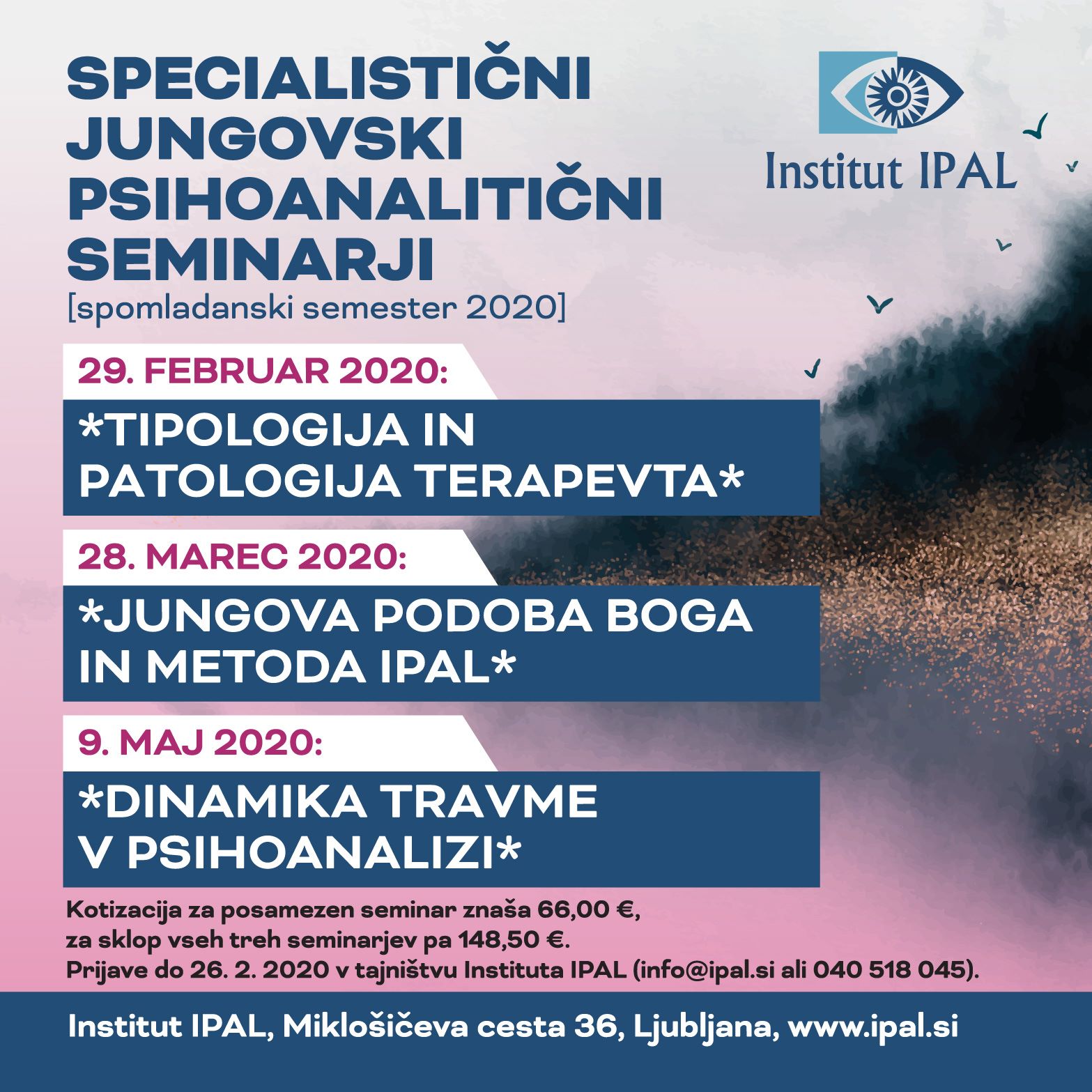 Kotizacija za posamezen seminar znaša 66,00 €, za sklop vseh treh seminarjev pa 148,50 € (25% popust). Prijave do 26.2.2020 v tajništvu Instituta IPAL (info@ipal.si ali 040 518 045).